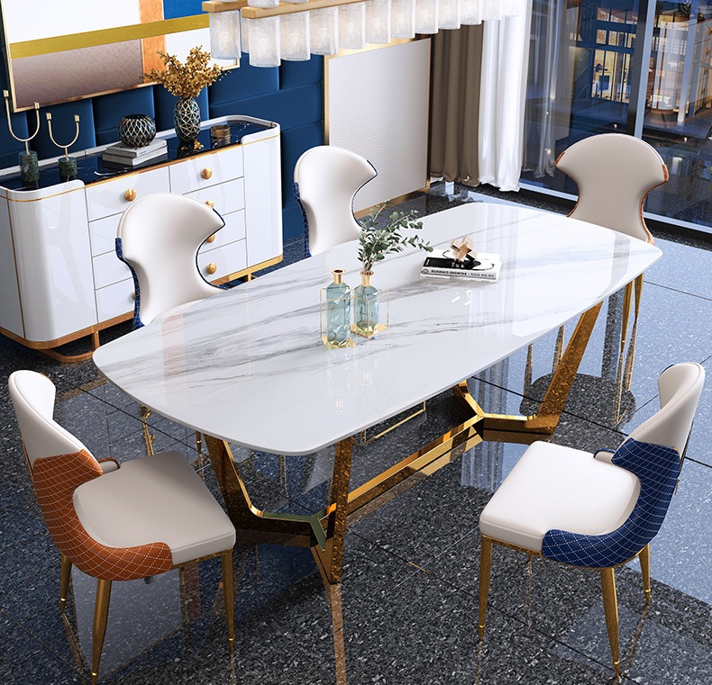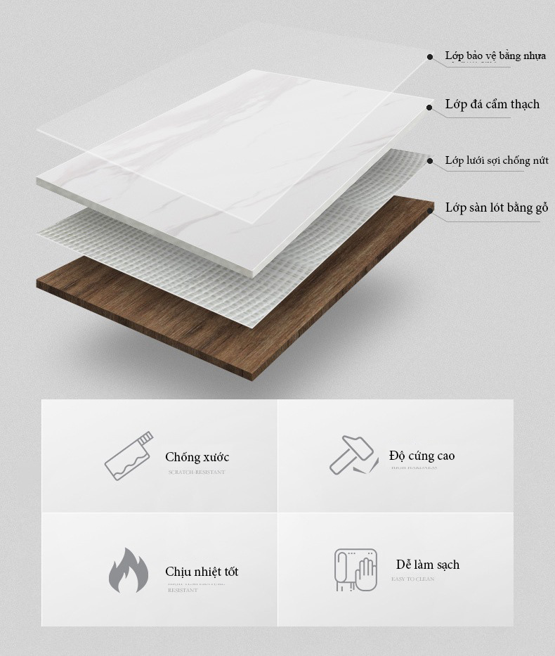 – Chất liệu: Khung bàn bằng inox mạ titan với công nghệ sơn PVD bền màu với thời gian, mặt bàn sử dụng chất liệu đá ceramic với khả năng chống xước, chịu va đập, chịu nhiệt, chống ố siêu tốt, với 3 màu chủ đạo là xanh ý và trắng vân mây, đen